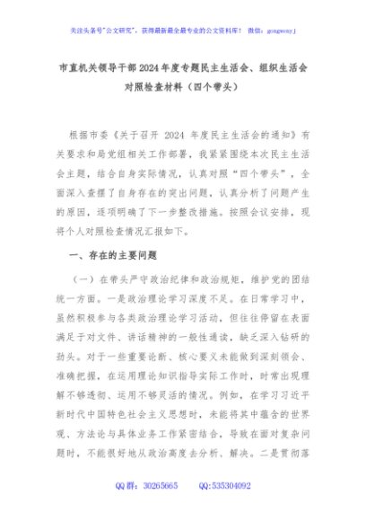 / 市直机关领导干部2024年度专题民主生活会、组织生活会对照检查材料(四个带头)