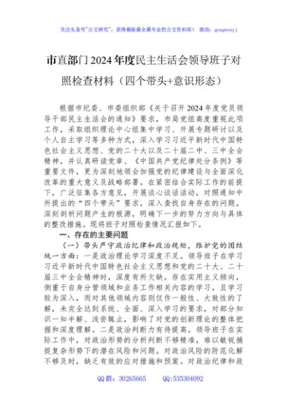 / 市直部门2024年度民主生活会领导班子对照检查材料(四个带头+意识形态)
