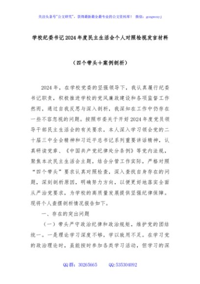/ 学校纪委书记2024年度民主生活会个人对照检视发言材料(四个带头+案例剖析)