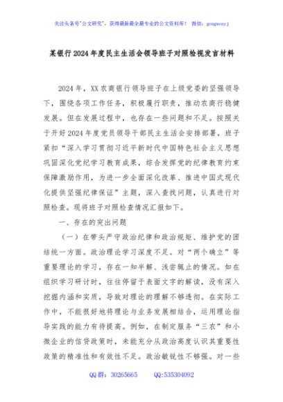 / 某银行2024年度民主生活会领导班子对照检视发言材料