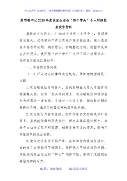 / 某市委书记2025年度民主生活会“四个带头”个人对照检查发言材料