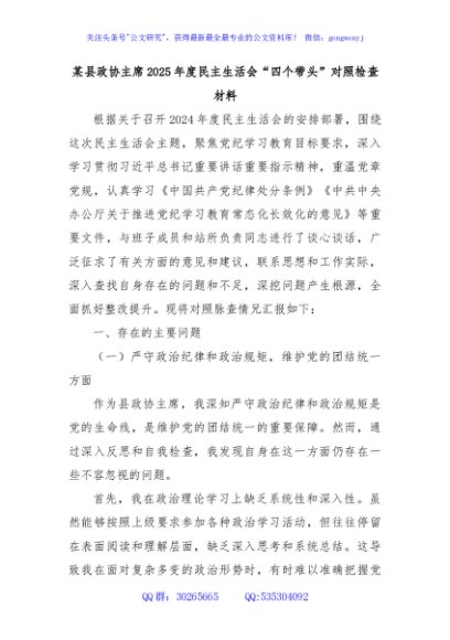 / 某县政协主席2025年度民主生活会“四个带头”对照检查材料