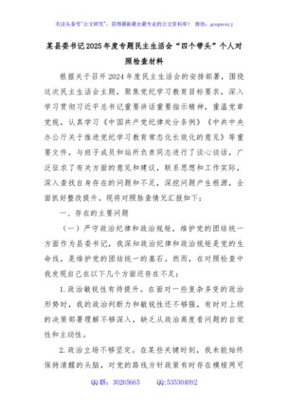 / 某县委书记2025年度专题民主生活会“四个带头”个人对照检查材料