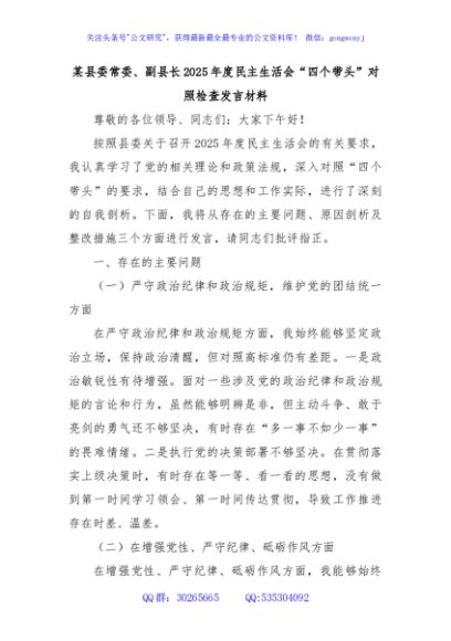 / 某县委常委、副县长2025年度民主生活会“四个带头”对照检查发言材料