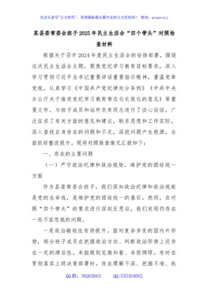 / 某县委常委会班子2025年民主生活会“四个带头”对照检查材料