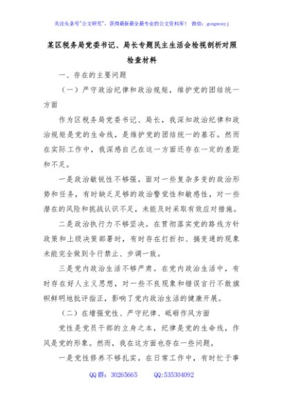 / 某区税务局党委书记、局长专题民主生活会检视剖析对照检查材料