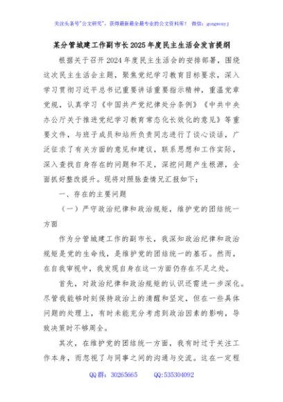 / 某分管城建工作副市长2025年度民主生活会发言提纲