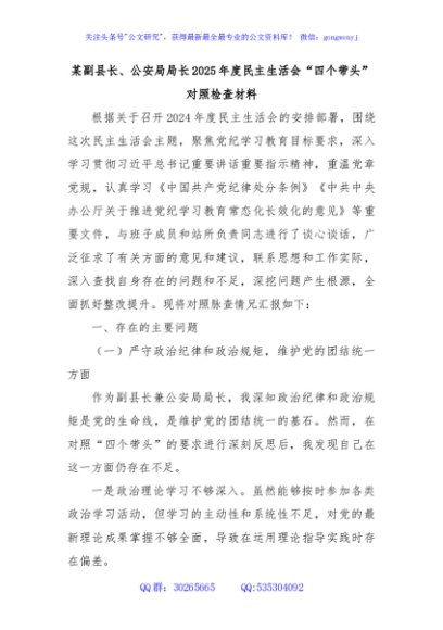 / 某副县长、公安局局长2025年度民主生活会“四个带头”对照检查材料