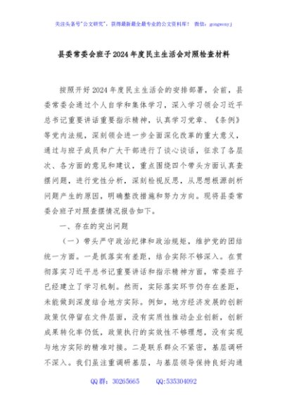/ 县委常委会班子2024年度民主生活会对照检查材料