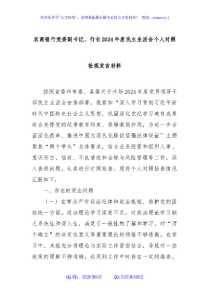 / 农商银行党委副书记、行长2024年度民主生活会个人对照检视发言材料