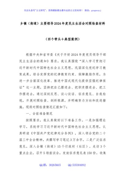 / 乡镇(街道)主要领导2024年度民主生活会对照检查材料(四个带头+典型案例)