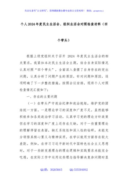 / 个人2024年度民主生活会、组织生活会对照检查材料(四个带头)