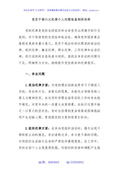 / 党员干部六大纪律个人对照检查剖析材料