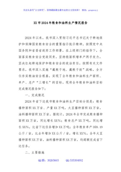 / XX市2024年粮食和油料生产情况报告