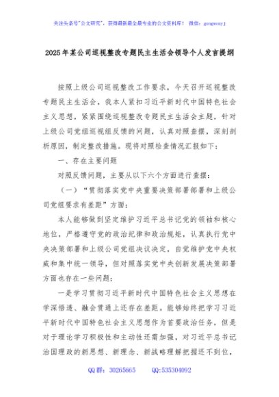 / 2025年某公司巡视整改专题民主生活会领导个人发言提纲