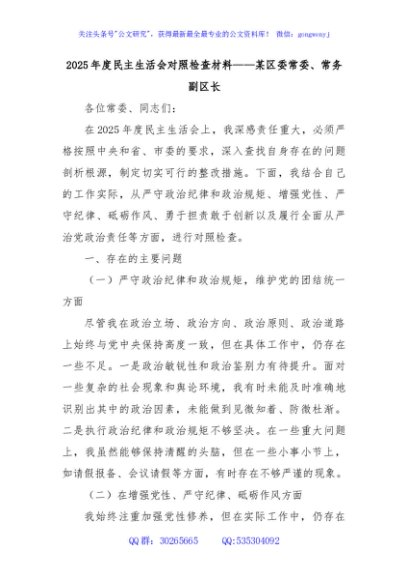 / 2025年度民主生活会对照检查材料——某区委常委、常务副区长