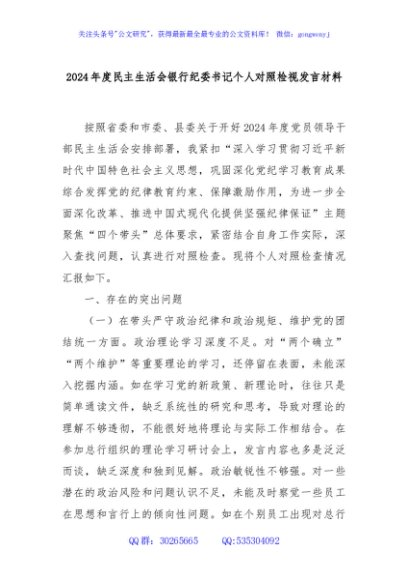/ 2024年度民主生活会银行纪委书记个人对照检视发言材料