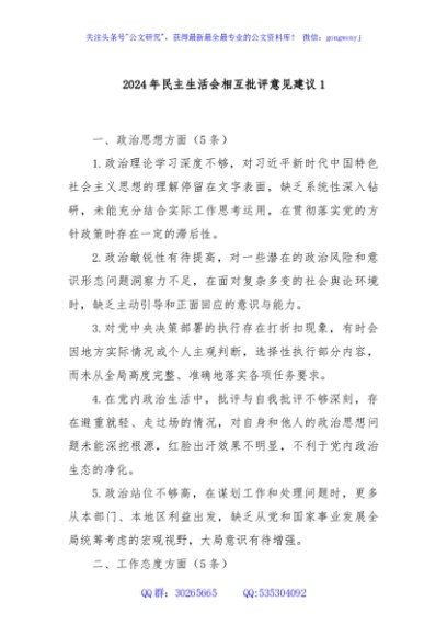 / 2024年民主生活会相互批评意见建议1