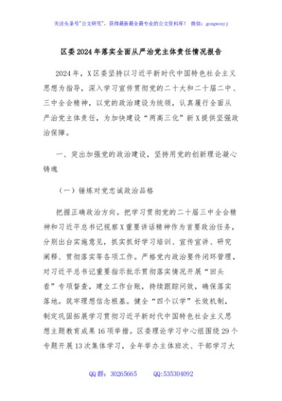 / 区委2024年落实全面从严治党主体责任情况报告