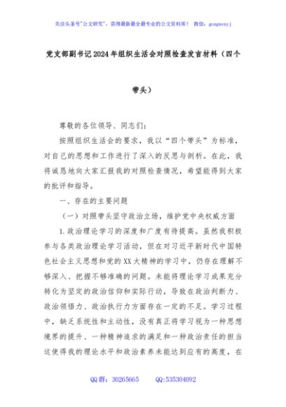 / 党支部副书记2024年组织生活会对照检查发言材料(四个带头)
