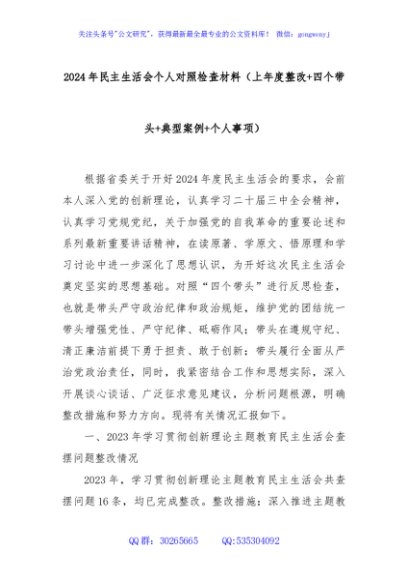 / 2024年民主生活会个人对照检查材料(上年度整改+四个带头+典型案例+个人事项)