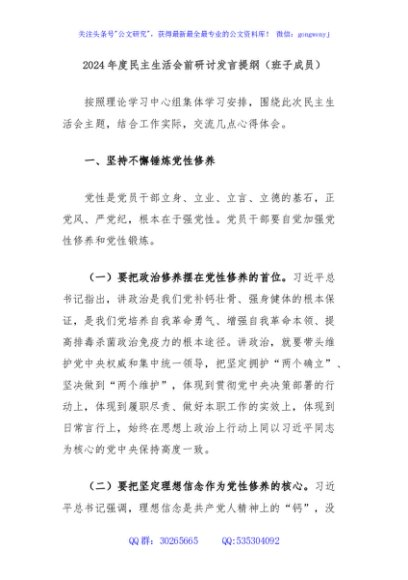/ 2024年度民主生活会前研讨发言提纲(班子成员)