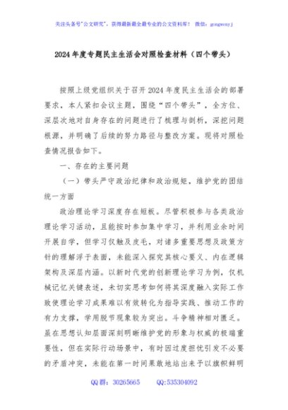 / 2024年度专题民主生活会对照检查材料(四个带头)