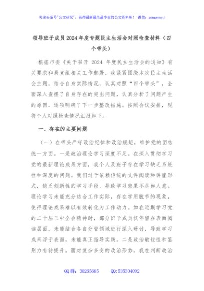 / 领导班子成员2024年度专题民主生活会对照检查材料(四个带头)