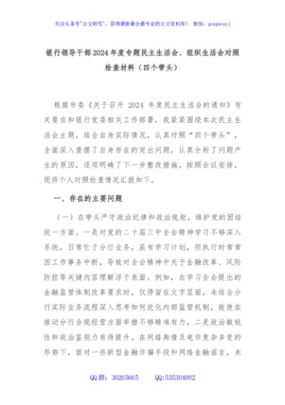 / 银行领导干部2024年度专题民主生活会、组织生活会对照检查材料(四个带头)