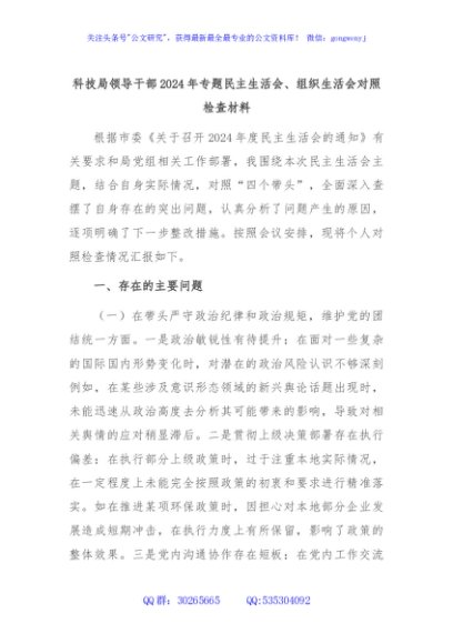/ 科技局领导干部2024年专题民主生活会、组织生活会对照检查材料