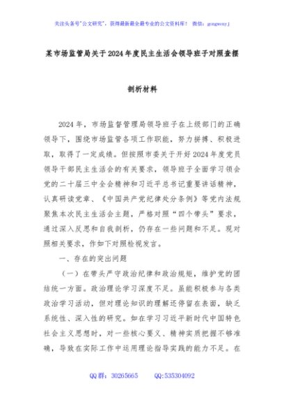 / 某市场监管局关于2024年度民主生活会领导班子对照查摆剖析材料