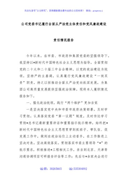 / 公司党委书记履行全面从严治党主体责任和党风廉政建设责任情况报告