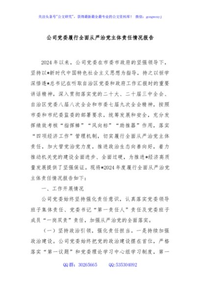 公司党委书记履行全面从严治党主体责任和党风廉政建设责任情况报告