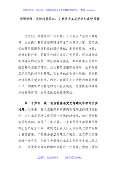 / 党课讲稿:坚持问题导向,全面提升基层党组织建设质量