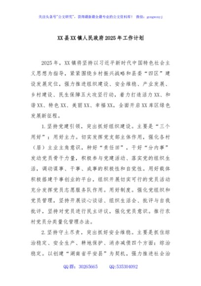 / XX县XX镇人民政府2025年工作计划