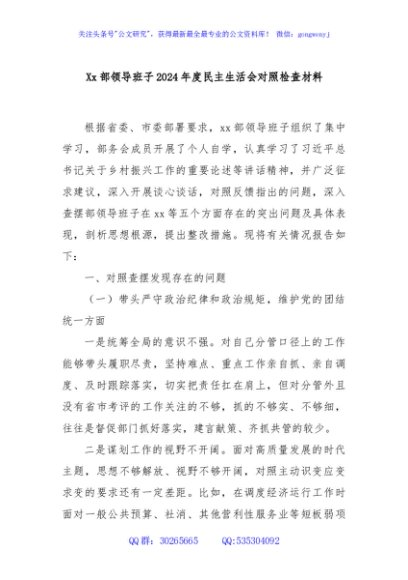/ Xx部领导班子2024年度民主生活会对照检查材料