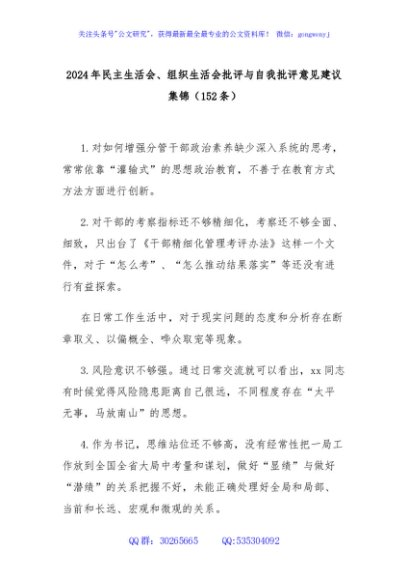 / 2024年民主生活会、组织生活会批评与自我批评意见建议集锦(152条)