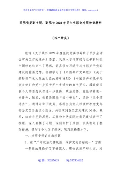 / 医院党委副书记、副院长2024年民主生活会对照检查材料(四个带头)