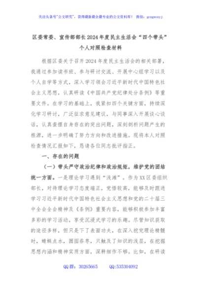 / 区委常委、宣传部部长2024年度民主生活会“四个带头”个人对照检查材料