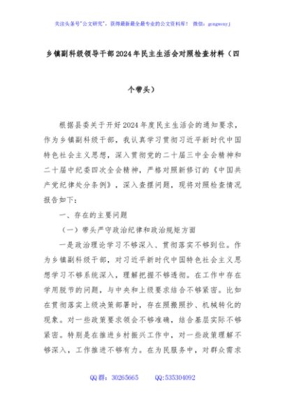 / 乡镇副科级领导干部2024年民主生活会对照检查材料(四个带头)