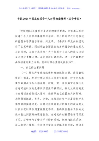 / 书记2024年民主生活会个人对照检查材料(四个带头)