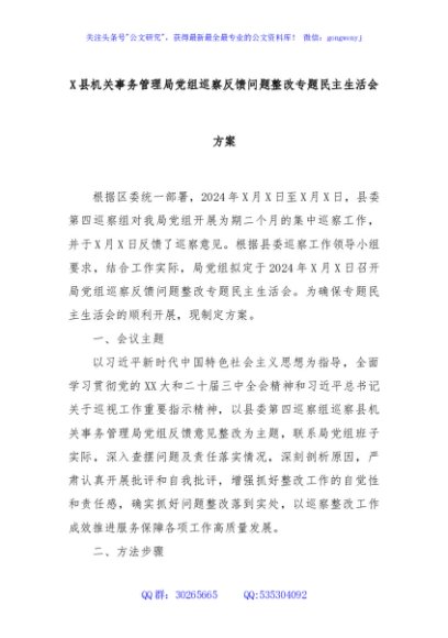 / X县机关事务管理局党组巡察反馈问题整改专题民主生活会方案