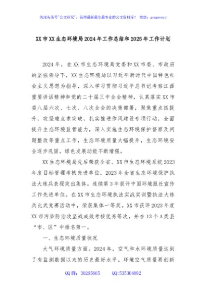 / XX市XX生态环境局2024年工作总结和2025年工作计划