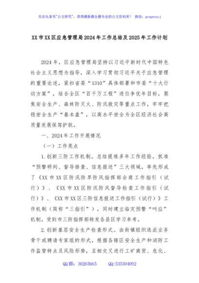 / XX市XX区应急管理局2024年工作总结及2025年工作计划