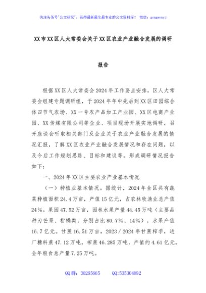 / XX市XX区人大常委会关于XX区农业产业融合发展的调研报告