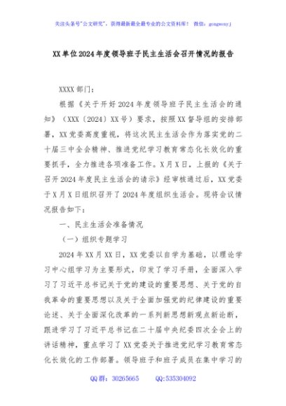 / XX单位2024年度领导班子民主生活会召开情况的报告