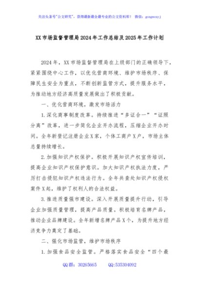/ XX市场监督管理局2024年工作总结及2025年工作计划
