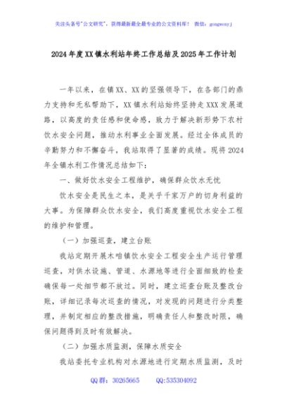 / 2024年度XX镇水利站年终工作总结及2025年工作计划