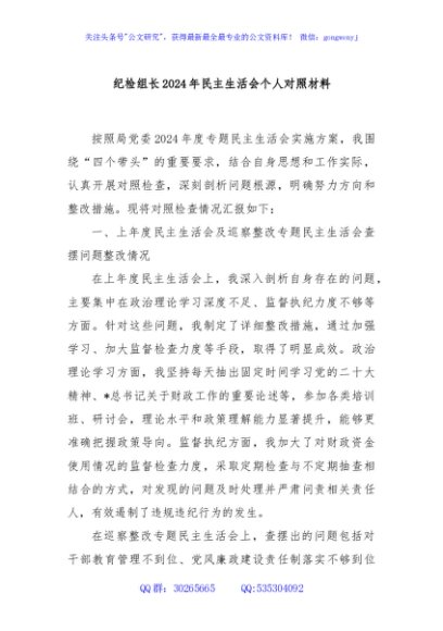 / 纪检组长2024年民主生活会个人对照材料