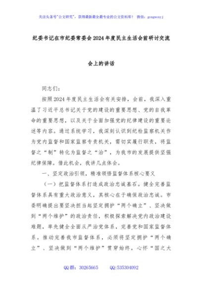 / 纪委书记在市纪委常委会2024年度民主生活会前研讨交流会上的讲话